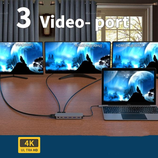 HUB USBC, 13 in 1 RikBo®, 1x 1000Mbps Gigabit Ethernet Port, 2x 4k HDMI, 1x VGA Port, 3x USB3.0, 1xUSB2.0, 1x USB-C Data Port, 1x TypeC PD Port, 1 x SD Card Slot, 1x TF Card, 1 x 3.5mm Audio / Mic