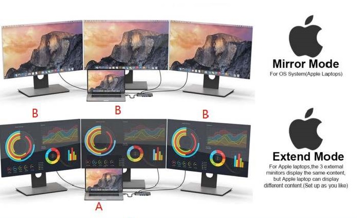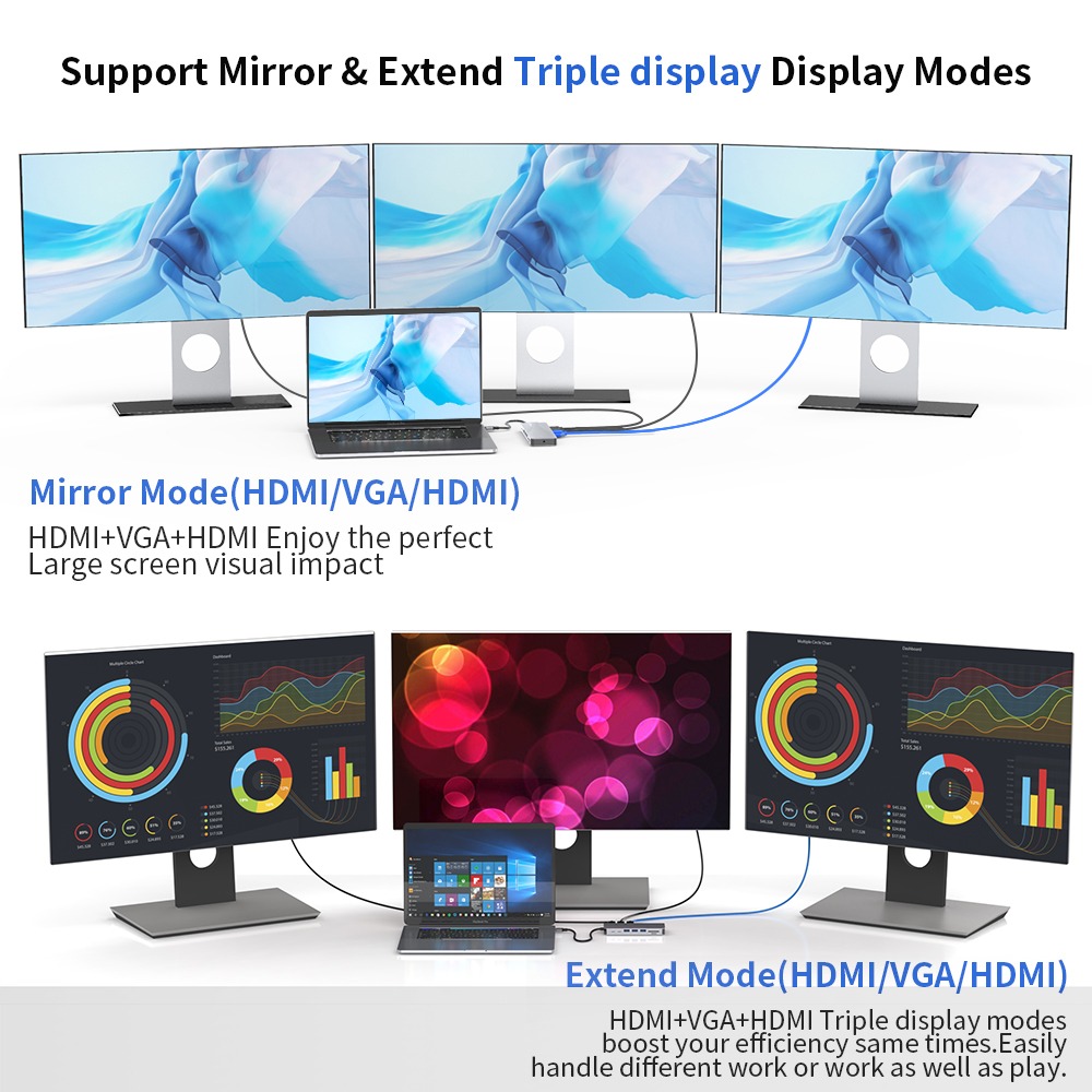 Cele doua porturi HDMI 4K si portul VGA 1080p va permite sa oglinditi sau sa extindeti afisajul laptopului/telefonului mobil pe televizor, monitor sau proiector cu rezolutii de pana la 4K UHD (3840x2160*30Hz)