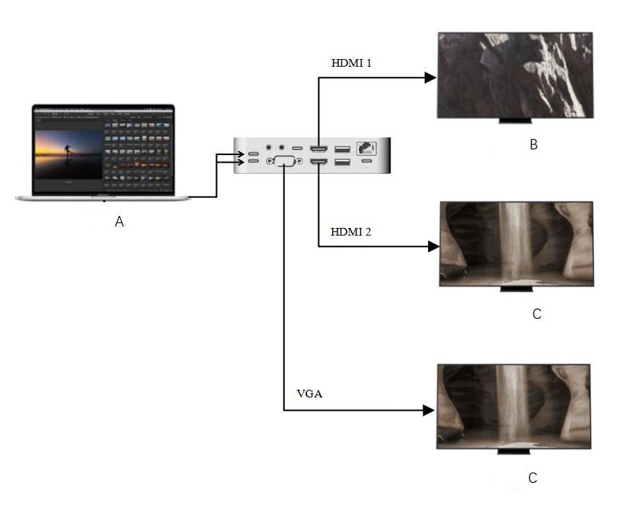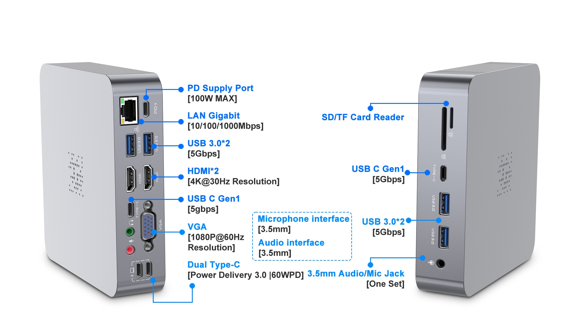 Hub Adaptor 16 in 2 USB TypeC RikBo®, 1x Gigabit Ethernet, 2 x 4K HDMI, 1 x VGA, 4 x USB3.0 , 2x TypeC Data Port, 1 x TypeC PD port, 1 x Mic, 1 x Audio Jack, 1 x Jack si Mic, 1 x TF card , 1 x SD card Compatibil Macbook Pro Air