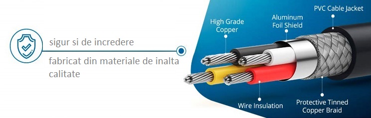 Cablul de aliementare la priza este construit din materiale de inalta calitate. Elementele din cupru pur si materialele de pvc utilizate ofera cel mai ridicat standard de securitate, protectie si utilizare pe termen lung
