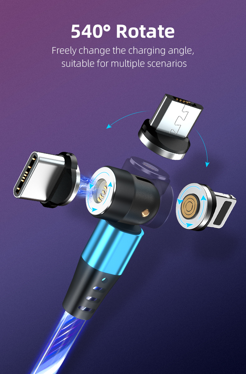 Cablu de incarcare rapida si transfer de date cu iluminare LED 5 pini,3.5mm, 3A, magnetic,  3 in 1 Lightning, Type-C , micro-USB rotatie 540 grade